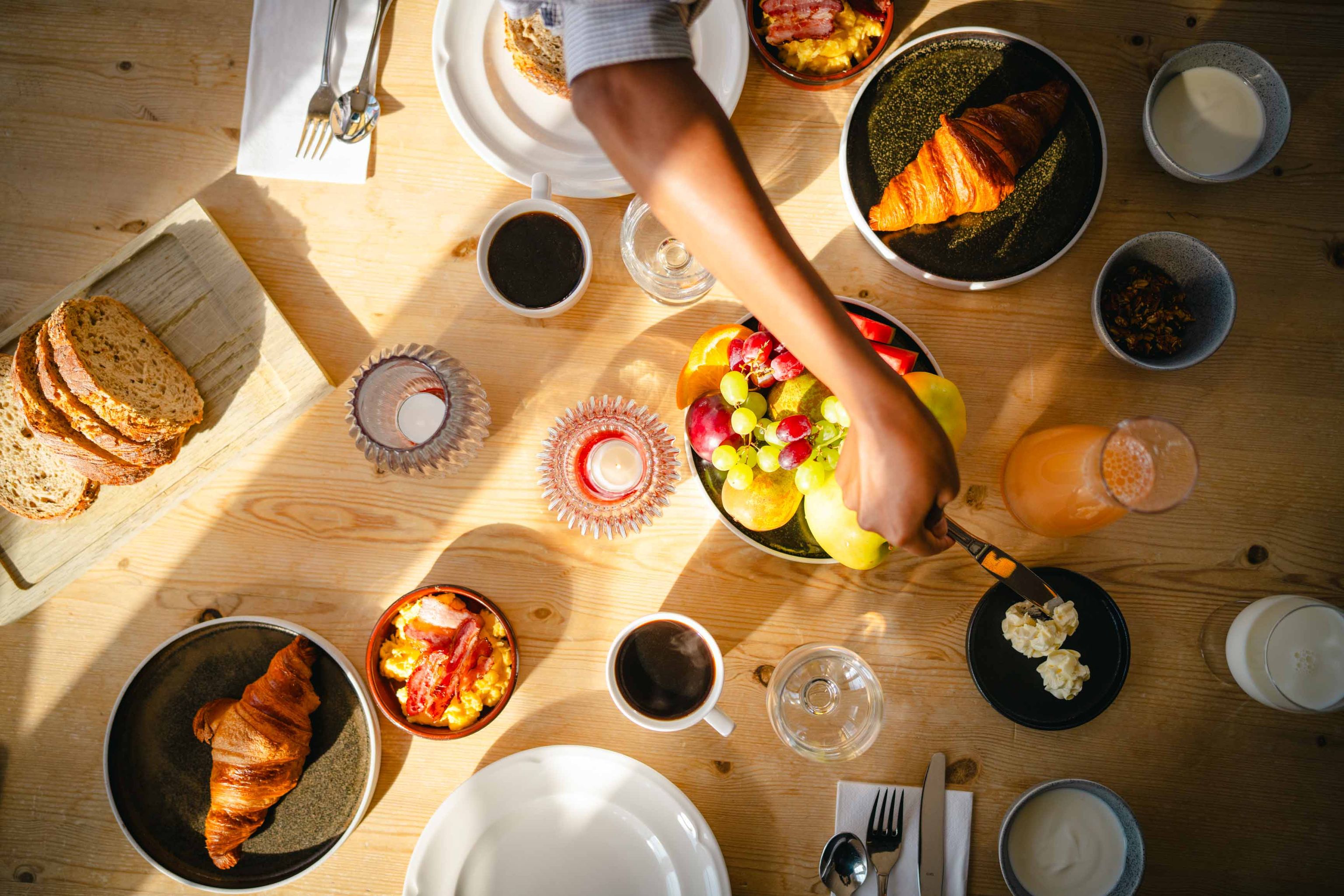 Start each morning with our unique breakfast experience, a personal buffet served at your table the table with, among other things, our own hams, local cheeses and local farm milk from Ødhumbla (Norway's smallest dairy!).