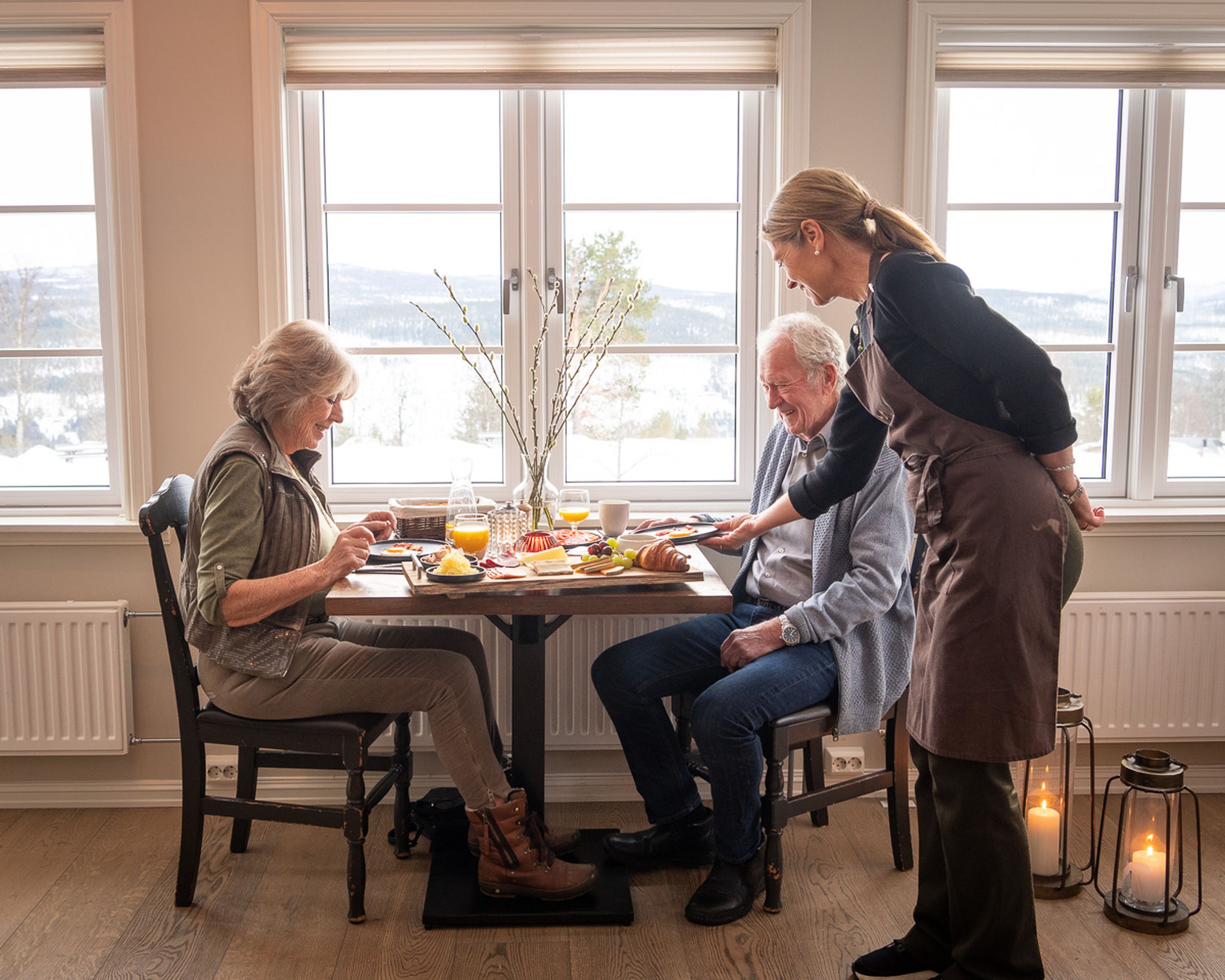 Hver morgen starter dere dagen med vår særegne frokostopplevelse – en personlig buffet servert på bordet med blant annet våre egne skinker, lokale oster og lokal gårdsmelk fra Ødhumbla (Norges minste meieri). Herfra smører dere selv matpakken for å ta med ut på fjelltur, slik at dagene kan fylles med både frisk luft og gode minner.